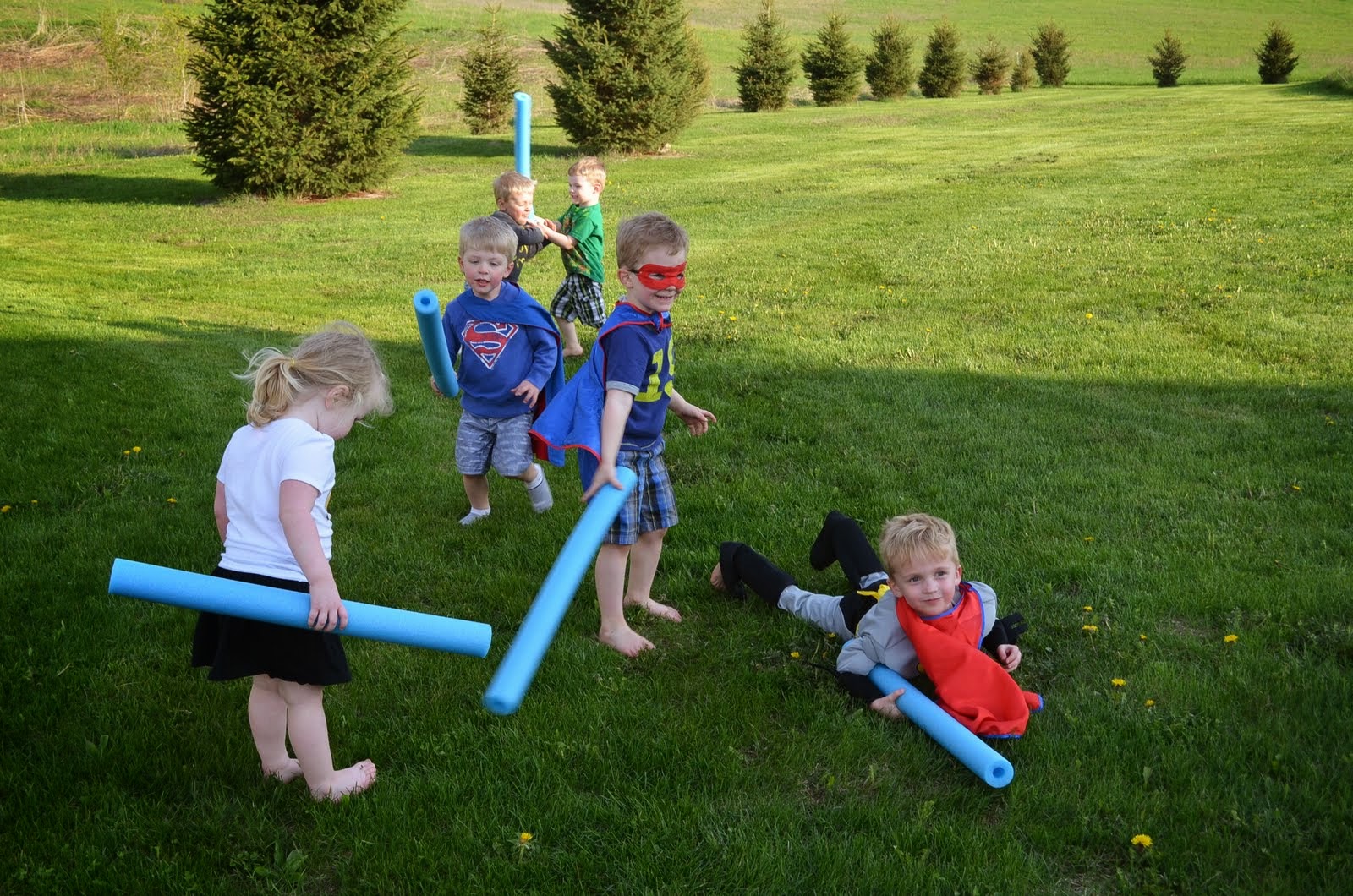 Playing Superhero tag in the yard with their "Swords".