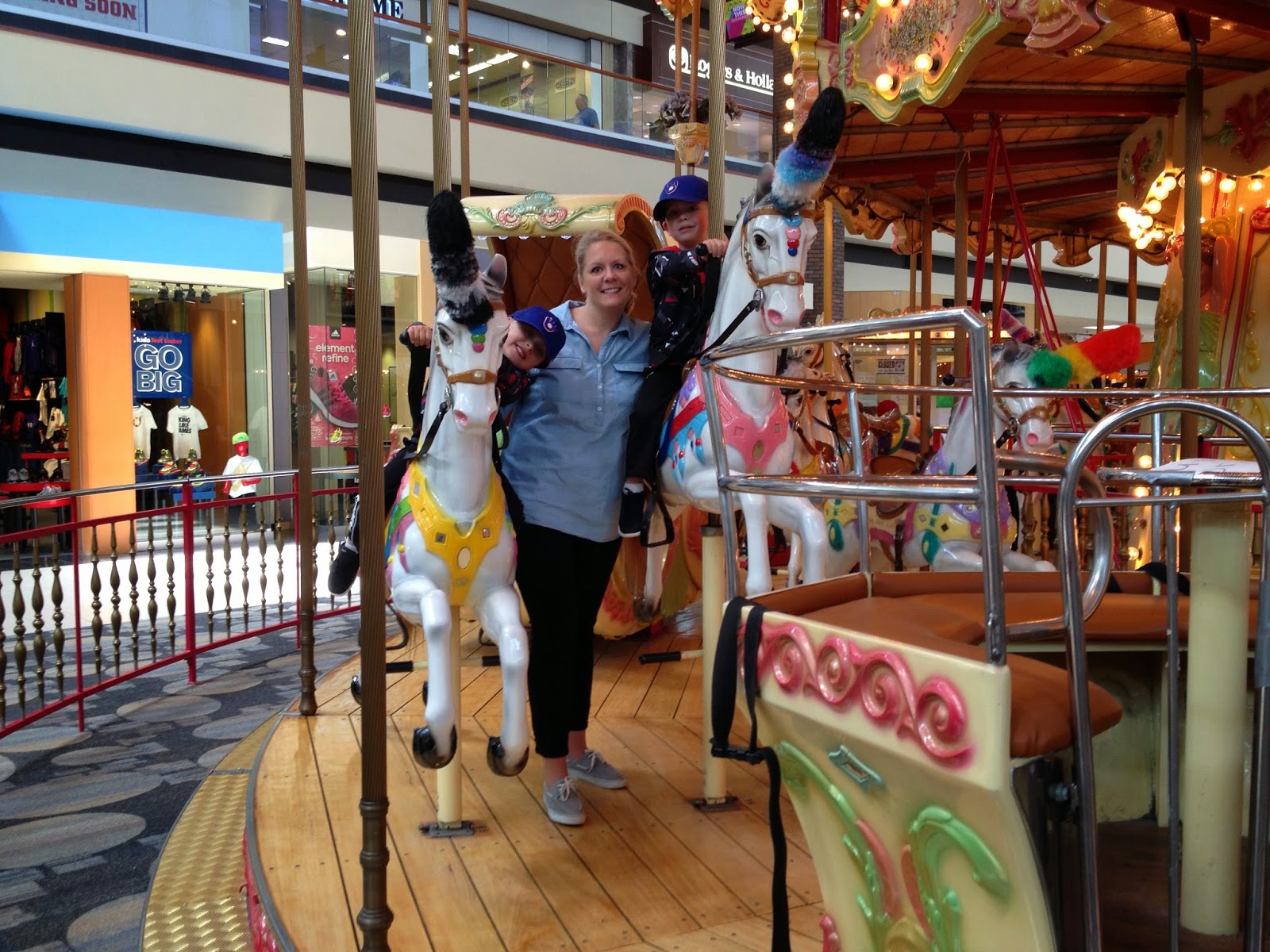 After climbing the dirt hills, the boys officially trashed their one and only pair of shoes. They were not salvageable for school or "good" anymore, so off we went to the cities. I like the Maplewood Mall for they have a kids footlocker and kids Journeys. We have been talking a lot lately about being different and how it's okay to want different things. Of course once it was down for them to make a decision on the shoes they wanted, both picked the same black Nikes. Ashton's tie because he is in a size 11 (bigfoot) which pushes him to "youth". Aiden's have Velcro because he is a size 10 and still in "toddler". The spotted the Carousel and this was a real incentive to be good shoppers!